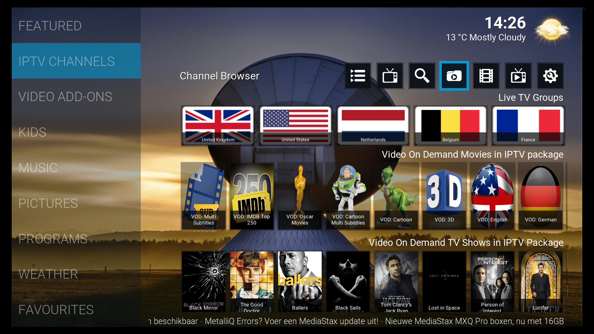In het hoofdmenu kan je nu sneller navigeren naar de zenders en de Video On Demand content uit het IPTV pakket. De Video On Demand functie is flink verbeterd, de verzameling films en series die bij elke IPTV aansluiting wordt meegeleverd is nu beter te benaderen en af te spelen. Deze verbeteringen zijn mogelijk gemaakt dankzij een specifieke add-on die exclusief voor MediaStax boxen is ontwikkeld.